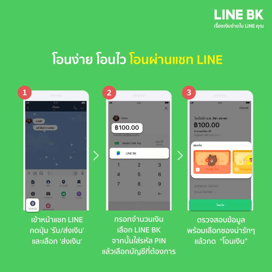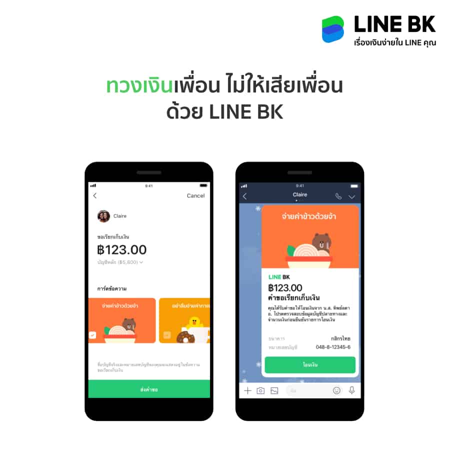 จะหารบิลและทวงเงินเพื่อนทีไรแสนอึดอัดใจ ฟีเจอร์เด็ดที่สร้างมาเพื่อให้การหารบิลและทวงเงินเพื่อนเป็นเรื่องง่ายไม่ต้องกลัวเสียเพื่อนอีกต่อไป เพราะLINE BK จะส่งคำขอทวงเงินแทนด้วยวิธีละมุนละม่อม แค่เปิดหน้าแชทเพื่อนคนนั้น แล้วกดปุ่มบวก (+) จากนั้นกด ‘รับ/ส่งเงิน’ และเลือก ‘ขอให้ส่งเงิน’ สำหรับการทวงเงินเพื่อนแบบซอฟท์ๆ แต่ถ้าต้องการหารบิลกันของกลุ่มเพื่อน ก็เข้าไปในกรุ๊ป LINE แล้วกดปุ่มบวก (+) กด ‘รับ/ส่งเงิน’ และเลือก ‘แชร์เงิน’ ซึ่งLINE BK จะช่วยหารค่าใช้จ่ายให้ทันที หรือจะปรับยอดเงินของแต่ละคนก็ได้ในกรณีที่หารค่าใช้จ่ายไม่เท่ากัน ก่อนกดส่งอย่าลืมเลือกหน้าซองพร้อมข้อความทวงแบบอ้อนๆ เพื่อความน่ารัก น่าคืน เมื่อกดส่งเสร็จ LINE BK จะส่งยอดไปเรียกเก็บในแชทของแต่ละคนในคลิกเดียวเท่านั้น เป็นการทวงเงินที่เซฟเวลาและเซฟความสัมพันธ์ได้เป็นอย่างดี