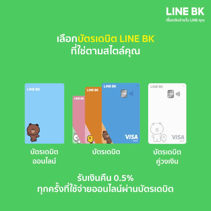 ฟีเจอร์สุดเจ๋งเอาใจขาชอปทุกไลฟ์สไตล์ สายชอปออนไลน์ แค่สมัครบัตรเดบิตออนไลน์ก็ใช้งานได้ทันทีไม่มีค่าธรรมเนียม แถมยังเป็นบัตรเดบิตรายแรกที่ได้เครดิตเงินคืน 0.5% เมื่อชอปออนไลน์ 100 บาทขึ้นไป หรือจะชอปหน้าร้านผ่านบัตรเดบิต LINE BK ที่มาพร้อมเทคโนโลยีการชำระเงินแบบ Contactless แตะบัตรผ่านเครื่อง EDC สะดวก สบาย ไร้สัมผัส รองรับการใช้จ่ายแบบไร้รอยต่อด้วยเครือข่าย VISA กว่า 61 ล้านร้านค้าทั่วโลก และสามารถเลือกเป็นเจ้าของบัตรดีไซน์คาแรกเตอร์ LINE FRIENDS ทั้งบราวน์ โคนี่ และแซลลี่ ได้อีกด้วย แต่หากอยากชอปแบบนอนสต๊อปไม่มีหยุด ไม่มีสะดุด ต้องเลือกบัตรเดบิตคู่วงเงิน เพราะบัตรนี้เค้ามีบริการแจ้งเตือนเมื่อยอดเงินในบัญชีไม่พอและสามารถดึงเงินจากวงเงินให้ยืมมาใช้ต่อได้ทันที
