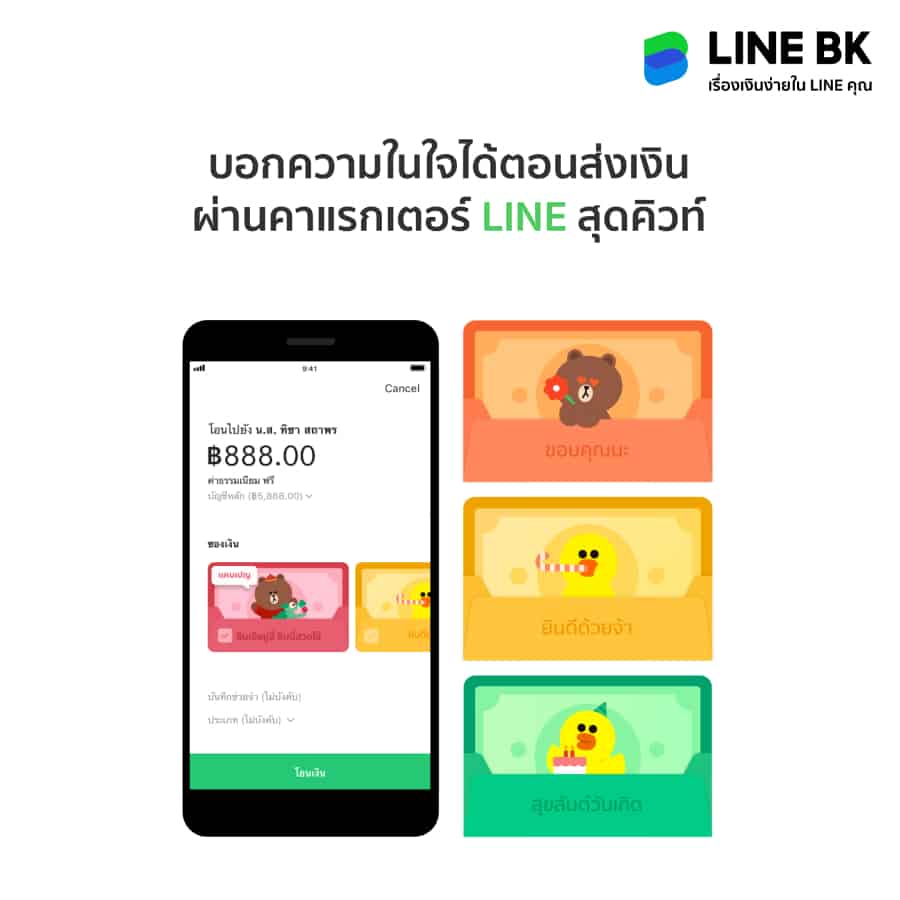 ฟีเจอร์ที่ออกมาเอาใจสาวกคาแรกเตอร์ LINE FRIENDS เปลี่ยนประสบการณ์โอนเงิน จากสลิปแบบเดิมๆ เป็นซองใส่เงินดีไซน์สุดน่ารักที่สามารถเลือกซองเงินได้หลายแบบ หลายข้อความ บอกความรู้สึกได้ตรงใจ จะขอบคุณ บอกรัก หรือใส่ซองงานแต่ง ก็บอกได้ด้วย LINE BK