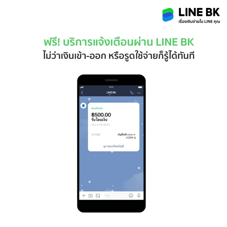 ฟีเจอร์ที่เหมือนมีเลขาส่วนตัวคอยแจ้งเตือนทุกธุรกรรมทางการเงินผ่าน LINE BK ทั้ง รับ โอน จ่าย หรือกดเงินจากตู้ ไม่ต้องกังวลว่าเงินทองจะรั่วไหล นอกจากนี้คนที่มีบัญชี KBank ก็นำมาผูกใน LINE BK ให้แจ้งเตือนใน LINE ได้เช่นกัน ที่เจ๋งสุดทุกการเคลื่อนไหวของบัญชีจะเก็บบันทึกไว้ เรียกดูเมื่อไรก็ได้ ไม่ต้องจำให้สมองล้าอีกต่อไป