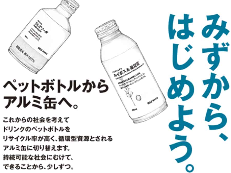 วันที่ 23 เมษายนที่ผ่านมา ร้าน MUJI ได้หยุดจำหน่ายเครื่องดื่มในรูปแบบขวดพลาสติกในร้านค้าทุกแห่งทั่วประเทศญี่ปุ่น ผลิตภัณฑ์เครื่องดื่มบางชนิดจะถูกยกเลิกการขายเมื่อสินค้านั้นหมด ในขณะที่บรรจุภัณฑ์สำหรับผลิตภัณฑ์ที่เหลืออีก 12 รายการจะถูกเปลี่ยนเป็นอะลูมิเนียมแทน
