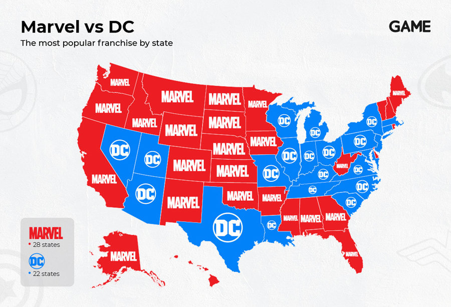 รัฐในสหรัฐอเมริกาที่นิยม Marvel เช่น อลาบามา , ฮาวาย , ฟลอริดา และไวโอมิง ส่วนรัฐที่นิยม DC ได้แก่ นิวยอร์ก , อินเดียน่า , แอริโซนา , และนอร์ทแคโรไลนา