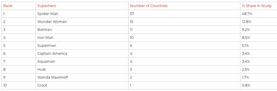 จากผลการเก็บข้อมูลพบว่า Spider-Man เป็นซุปเปอร์ฮีโร่ที่ได้รับความนิยมสูงที่สุดในโลกโดยติดอันดับการค้นหามากสุดถึง 57 ประเทศ