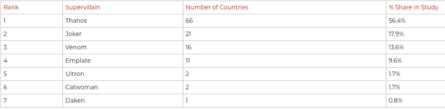นอกจากฮีโร่แล้ว เว็บไซต์ GAME.co.uk ยังเจาะลึกไปถึงข้อมูลของตัวร้ายของทั้งสองจักรวาลในแต่ละประเทศ พบว่า Thanos เป็นตัวร้ายที่ได้รับความนิยมสูงที่สุด โดยติดอันดับการค้นหามากสุดถึง 66 ประเทศ รวมถึง แคนาดา , ออสเตรเลีย , ไอร์แลนด์ และแอฟริกาใต้