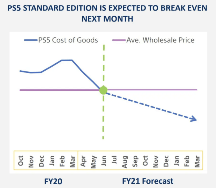 จากกราฟในเอกสาร จะเห็นว่า ตั้งแต่การเริ่มวางจำหน่ายในเดือนตุลาคมปีที่แล้ว ราคาต้นทุนของ PS5 นั้น อยู่สูงกว่าราคาขายส่งมาโดยตลอด และในช่วงต้นปี จะเห็นว่าต้นทุนมีการดีดตัวสูงขึ้น (คาดว่าเป็นปัญหาเรื่องการคลาดแคลนชิปเซ็ตจากซัพพลายเออร์) แต่พอเข้าเดือนเมษายนมา ต้นทุนก็ลดลงอย่างรวดเร็ว และในจุดตัดในเดือน มิถุนายน ก็คือช่วงที่การขายเครื่อง PlayStation 5 จะเริ่มมีกำไรแล้วนั่นเอง