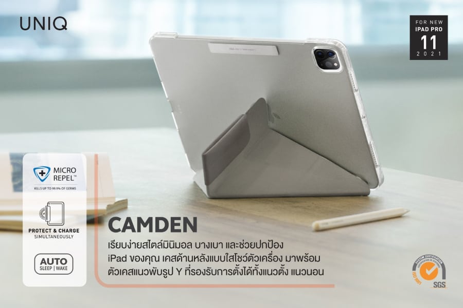 โดยสามารถใช้ได้ทั้งแบบแนวตั้งสำหรับการดูหนังและแนวนอนสำหรับการพิมพ์ เพื่อให้คุณเพลิดเพลินไปกับการใช้ทำงานหรือการพักผ่อน อาทิ ดูหนัง เล่นเกม การสเก็ตภาพ หรือจดไอเดียสุดเจ๋งได้อย่างเต็มที่ รองรับ Sleep/Wake อีกทั้งวัสดุด้านในเป็น Micro-Fiber ที่มาพร้อมคุณสมบัติ Anti-Microbial ช่วยลดการสะสมและกำจัดเชื้อโรคที่เป็นอันตรายได้ในตัวเองถึง 99.9% (รับรองโดย SGS) ตลอดอายุการใช้งานเลยทีเดียว โดยเคส Uniq iPad Pro 11 รุ่น CAMDEN มีให้เลือก 2 สี ได้แก่ สี Grey และ Pink วางจำหน่ายในราคาเพียง 1,190 บาท