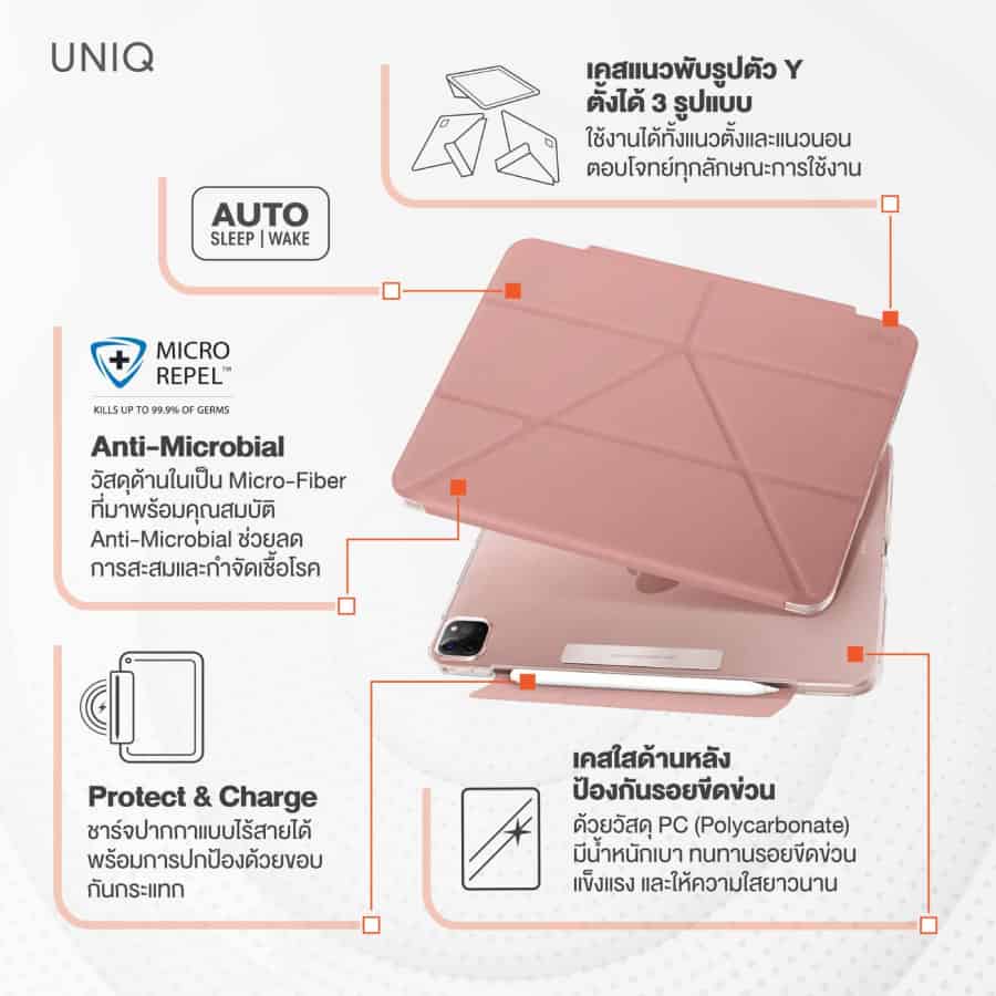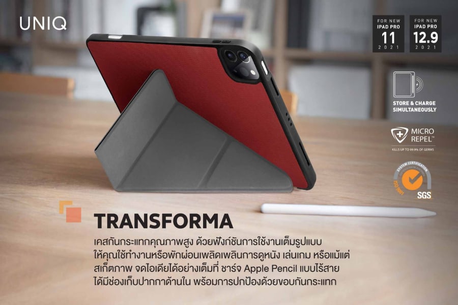 ช่วยลดการสะสมและกำจัดเชื้อโรคที่เป็นอันตรายได้ในตัวเองถึง 99.9% (รับรองโดย SGS) ตลอดอายุการใช้งานเลยทีเดียว อีกทั้งเคส iPad Pro 11ยังสามารถใช้ร่วมกับ iPad Air 10.9 ได้ โดยเคส iPad Pro 11 รุ่น TRANSFORMA มีให้เลือก 2 สี ได้แก่ สี Blackและ Red วางจำหน่ายในราคาเพียง 1,390 บาท และ เคส Uniq iPad Pro 12.9 รุ่น TRANSFORMA มีให้เลือก 1 สี ได้แก่ สี Black วางจำหน่ายในราคาเพียง 1,690 บาท