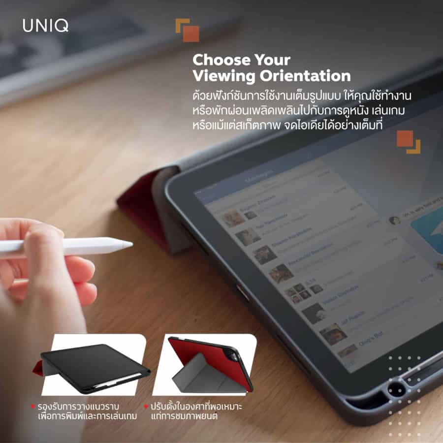 ตัวเคส รองรับ Sleep/Wake ยิ่งไปกว่านั้นวัสดุด้านในเป็น Micro-Fiber ที่มาพร้อมคุณสมบัติ Anti-Microbial ช่วยลดการสะสมและกำจัดเชื้อโรคที่เป็นอันตรายได้ในตัวเองถึง 99.9% (รับรองโดย SGS) ตลอดอายุการใช้งานเลยทีเดียว โดยเคส Uniq iPad Pro 11 รุ่น MOVEN มีให้เลือก 2 สี ได้แก่ สี Charcoal (Grey) และ Burgundy (Maroon) วางจำหน่ายในราคาเพียง 1,490 บาท และ เคส Uniq iPad Pro 12.9 รุ่น MOVEN มีให้เลือก 1 สี ได้แก่ สี Charcoal (Grey) วางจำหน่ายในราคาเพียง 1,790 บาท