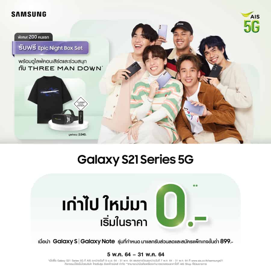 อีกหนึ่งความพิเศษของแคมเปญนี้ คือการคอลลาบอเรชันกันระหว่าง Samsung x AIS x GMM Grammy เพื่อสร้างสรรค์ ‘Epic Night Box Set’ ลิมิเต็ดบ็อกซ์เซ็ตจำนวน 200 ชุด ที่ออกแบบโดย THREE MAN DOWN ซึ่งในกล่องจะประกอบด้วย THREE MAN DOWN Galactic T-Shirt, แท่งไฟ THREE MAN DOWN และAIS 5G VR Port โดยผู้ที่จะได้ครอบครอง ต้องเป็นลูกค้าที่ซื้อ Samsung Galaxy S21 Series ระหว่างวันนี้ – 31 พ.ค. 64 ที่ AIS Shop และ AIS Online Store พร้อมลงทะเบียนบน www.ais.co.th/samsungs21 ระหว่างวันที่ 7 พ.ค. – 31 พ.ค. 64 เท่านั้น