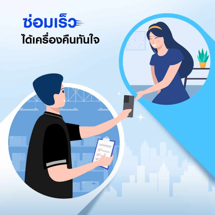 ซึ่งลูกค้าสามารถติดต่อใช้งานได้อย่างง่ายดายด้วยตนเองผ่านทางคอลเซ็นเตอร์ 1282 หรือ Live chat เพียงแค่แจ้งข้อมูลเบื้องต้นของอุปกรณ์ ที่อยู่ในการรับสินค้า และวันเวลาที่สะดวกให้เข้ารับเครื่อง เจ้าหน้าที่ก็จะมาทำการรับเครื่องในเวลาและสถานที่ดังกล่าว พร้อมทำความสะอาดฆ่าเชื้อไวรัส ก่อนส่งเครื่องกลับตามที่อยู่ที่ได้แจ้งไว้เมื่อเครื่องได้รับการซ่อมเสร็จสมบูรณ์ (ทั้งนี้ระยะเวลาในการซ่อมเครื่องอาจแตกต่างกันไปในแต่ละพื้นที่)