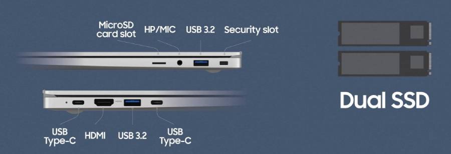 มาพร้อมกับระบบหน้าจอสัมผัส รองรับปากกา S Pen โดยมีหน้าจอ Super AMOLED ขนาด 13.3 นิ้ว แะ 15.6 นิ้วความละเอียด 1080p ที่ผ่านมาตรฐาน DisplayHDR 500 ใช้ชิปประมวลผลเดียวกันกับรุ่น Pro คือ Intel Core i3, i5 และ i7 Gen-11th พร้อมการ์ดจอ Iris Xe