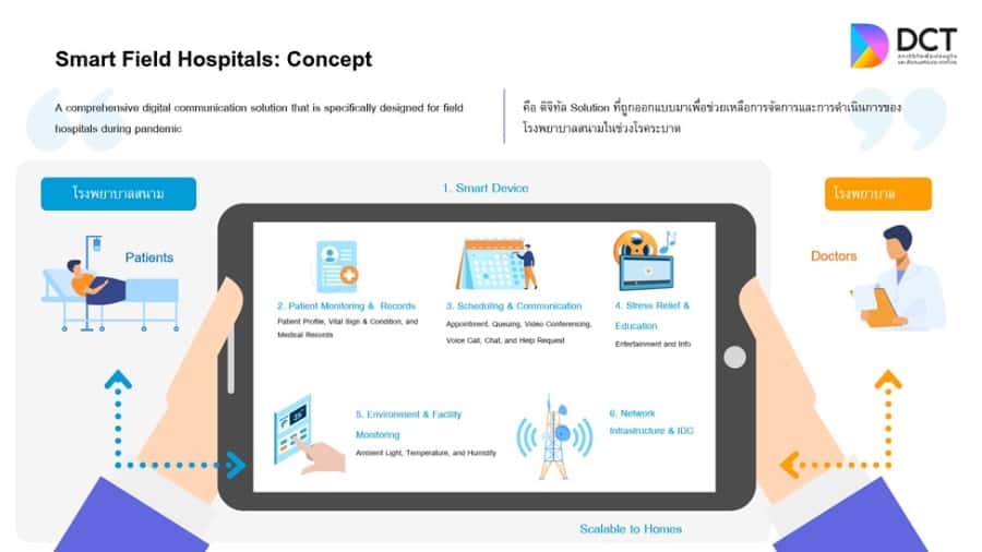 ทั้งนี้ ข้อสรุปความช่วยเหลือของสภาดิจิทัลฯ ที่ตอบโจทย์ความต้องการของโรงพยาบาลสนามในขณะนี้คือ การพัฒนาดิจิทัลโซลูชั่น “SMART FIELD HOSPITALS” ซึ่งจะเน้นการออกแบบให้สอดคล้องกับความต้องการของแพทย์กับคนไข้ รวมถึงโรงพยาบาลหลักกับโรงพยาบาลสนาม ให้ติดต่อสื่อสารระหว่างกันด้วยความมั่นใจ ปลอดภัย ลดความเสี่ยงในการแพร่ระบาดโรค และสามารถขยายการให้บริการหากมีจำนวนผู้ป่วยเพิ่มขึ้นในอนาคต ซึ่งประกอบด้วย