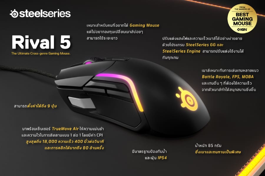 เมาส์เกมมิ่งรุ่นใหม่ชนิดมีสาย ที่จะสร้างปรากฎการณ์ใหม่ให้กับวงการเมาส์ เพื่อมอบประสิทธิภาพสุดคุ้มในการเล่นเกมทุกแนวตั้งแต่ RPG, FPS จนถึง MOBA และ Battle Royales ได้สนุกสนานยิ่งขึ้น ตอบสนองไลฟ์สไตล์ และความต้องการคอเกมยุคใหม่ที่ต้องการเล่นเกมหลากหลายแนวมากขึ้น โดยจุดเด่นของ Rival 5 อยู่ที่การออกแบบอย่างล้ำสมัยเพื่อให้เกมเมอร์ สามารถปรับเปลี่ยนการใช้งานให้เหมาะกับเกมที่ต้องการเล่นได้รวดเร็ว
