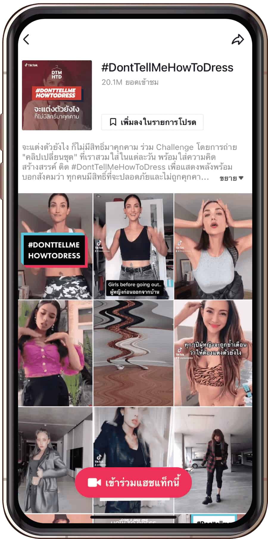 การต่อยอดจากโครงการดัง DON’T TELL ME HOW TO DRESS ที่มีวัตถุประสงค์เพื่อสร้างความตระหนักให้กับสังคมได้เห็นถึงความสำคัญและสร้างความเข้าใจที่ถูกต้องตั้งแต่ในวัยเยาวชนต่อเนื่องไปจนถึงวัยผู้ใหญ่เพื่อสะท้อนว่าการแต่งกายของผู้หญิงไม่ใช่สาเหตุที่ถูกคุกคาม โดยแคมเปญ #DontTellMeHowToDress TikTok ร่วมมือกับองค์กรชั้นนำ อย่าง องค์การเพื่อสตรีแห่งสหประชาชาติ หรือ ยูเอ็นวีเมน (UN Women), สถานทูต Canada, มูลนิธิหญิงชายก้าวไกล, สำนักงานกองทุนสนับสนุนการสร้างงเสริมสุขภาพ (สสส.)