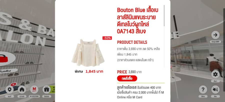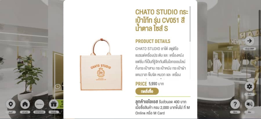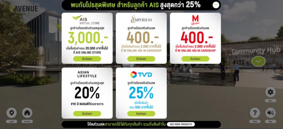 ความอลังการตระการตาที่อยากให้นักช้อปได้มาสัมผัส ยังอยู่ที่การนำแหล่งช้อปปิ้งหลากสไตล์มารวมไว้ในแพลตฟอร์มเดียว ได้แก่ AIS Virtual Store, The Emporium, The Mall Lifestore Ngamwongwan, Asian Lifestyle, TV Direct และ Community Hub รวมสินค้ามากกว่า 10,000 ชิ้น พร้อมส่วนลดยั่วใจนักช้อปมากมาย ยิ่งถ้าคุณเป็นลูกค้าเอไอเอสยังได้ส่วนลดและสิทธิพิเศษที่มากขึ้นเป็นเท่าตัว ถึงชื่อแหล่งช้อปปิ้งที่ว่ามาจะฟังดูคุ้นหู แต่พอนำเทคโนโลยี VR เข้ามาใช้ยิ่งทำให้การเข้าถึงความต้องการสินค้าเป็นเรื่องง่าย คลิกเดียวก็ขึ้นไปช้อปได้ถึงชั้นบนของห้าง ช้อปเสร็จ จัดไปอีกคลิกก็ลงมาชั้น 1 ได้ทันที อธิบายแบบนี้ภาพอาจจะยังไม่ชัด เลยจัดทริป #ช้อปห้างทิพย์ แบบรวบรัดมาให้ดูกัน