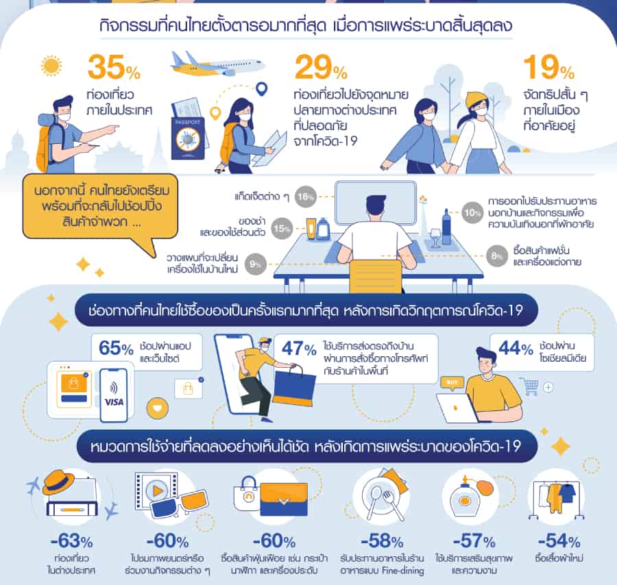 การศึกษาฉบับนี้ยังได้เจาะลึกในเรื่องของกิจกรรมต่าง ๆ ที่ผู้บริโภคชาวไทยตั้งตารอเมื่อสถานการณ์ในปัจจุบันคลี่คลายลง โดยสามกิจกรรมที่ผู้คนสนใจมากที่สุด คือ การท่องเที่ยวภายในประเทศ (35 เปอร์เซ็นต์) การท่องเที่ยวไปยังจุดหมายปลายทางต่างประเทศที่ปลอดภัยจากโควิด-19 (29 เปอร์เซ็นต์) และการจัดทริปสั้น ๆ ภายในเมืองที่อาศัยอยู่ (19 เปอร์เซ็นต์)