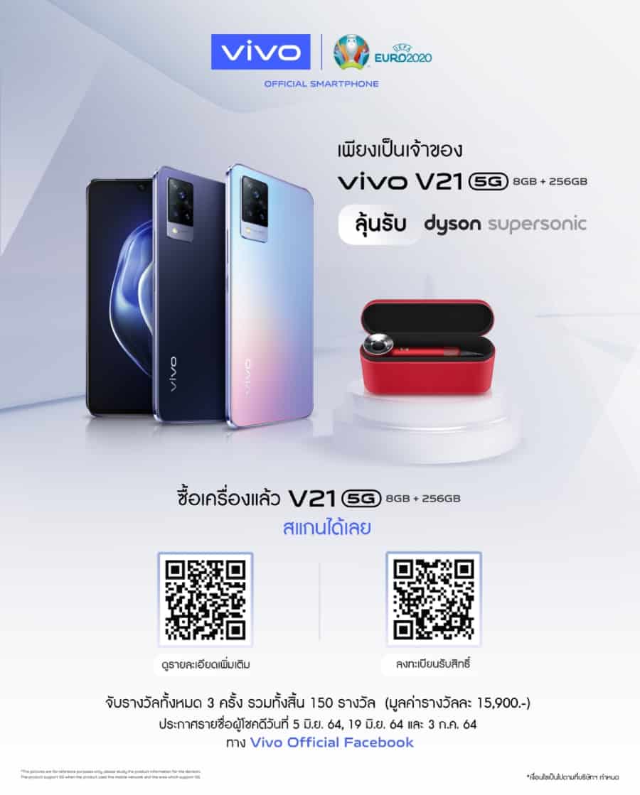ผ่าน Vivo Brand Shop ทุกสาขาและตัวแทนจำหน่ายทั่วประเทศ - รับสิทธิ์ลุ้นรางวัล ‘ไดร์เป่าผม Dyson Supersonic’ มูลค่า 15,900 บาท จำนวน 150 รางวัล เมื่อซื้อ