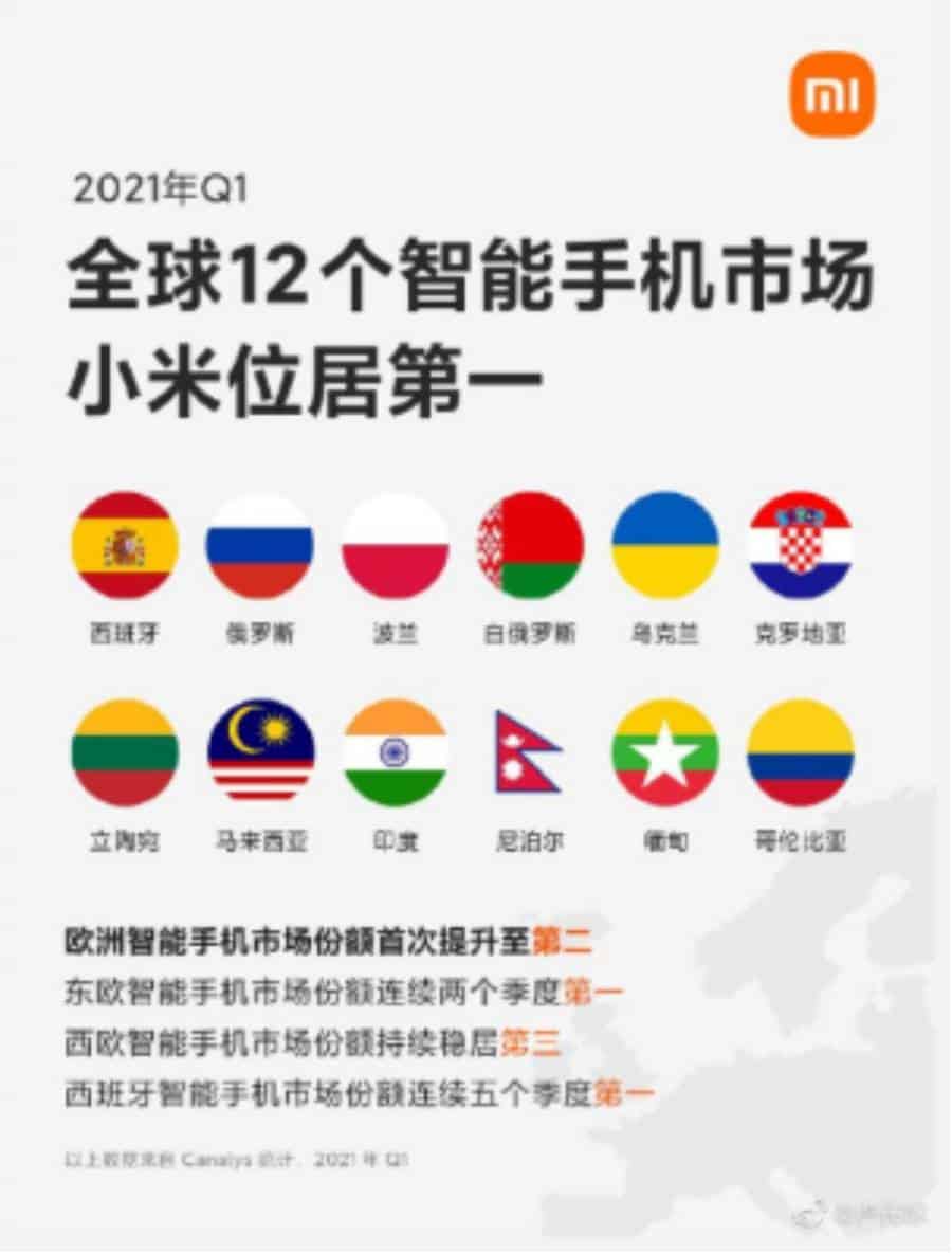 ตามโพสต์บน Weibo ของ Lu Weibing ประธานของ Xiaomi เผยว่าบริษัทประสบความสำเร็จในการครองอันดับ 1 ใน 12 ประเทศทั่ววโลกในไตรมาสที่ 1 ปี 2564 ซึ่งเขาได้แชร์โปสเตอร์ภาพที่เผยให้เห็นถึงความสำเร็จของแบรนด์
