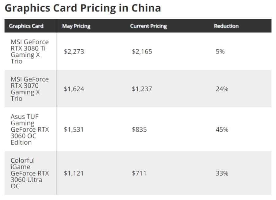 จากภาพจะเห็นได้ว่าการ์ดจอรุ่น GeForce RTX 3060 นั้นมีราคาที่ลดลงมากที่สุด เนื่องมาจากเป็นรุ่นระดับกลางที่ได้รับความนิยมสำหรับการขุดบิทคอยน์ในประเทศจีนมากที่สุดรุ่นหนึ่งเลยทีเดียว ในขณะที่การ์ดจออื่น ๆ เองก็ปรับลงมาด้วยเช่นกัน