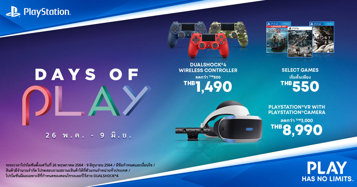 โซนี่ อินเตอร์แอคทีฟ เอนเตอร์เทนเมนต์ สิงคโปร์ ประกาศโปรโมชั่นพิเศษ “Days of Play” เริ่มวันนี้ – 9 มิถุนายน ศกนี้ เฉลิมฉลองไปกับคอมมิวนิตี้ PlayStation ที่ยอดเยี่ยมและขอบคุณแฟน ๆ ทั่วโลก โดยกิจกรรม Days of Play นั้นเป็นกิจกรรมประจำปีที่จัดขึ้นทั่วโลก ปีนี้จัดขึ้นเป็นปีที่ 5 มาพร้อมข้อเสนอสุดพิเศษสำหรับผลิตภัณฑ์ของ PlayStation และเกมต่าง ๆ ทั้งในส่วนของร้านค้าตัวแทนจำหน่าย PlayStation Authorized Dealers และร้านค้า Sony Stores ทุกสาขา จนกว่าสินค้าจะหมด