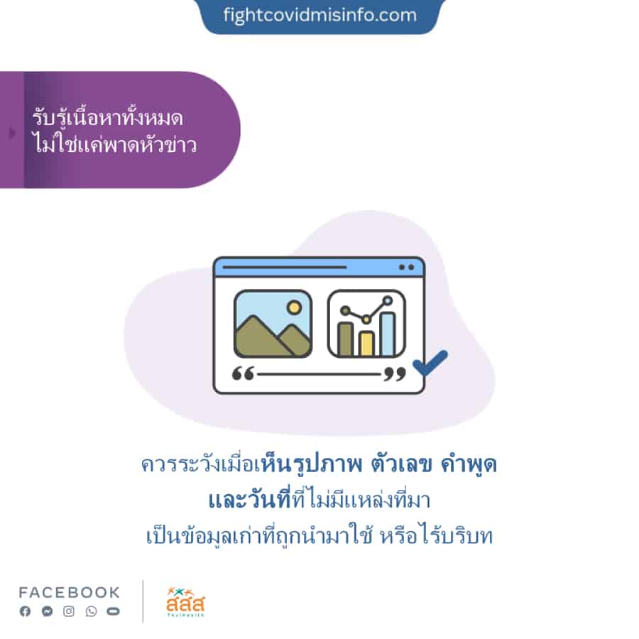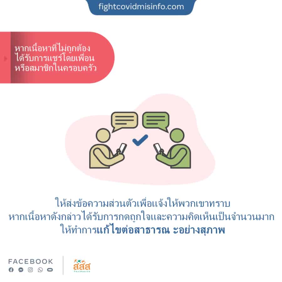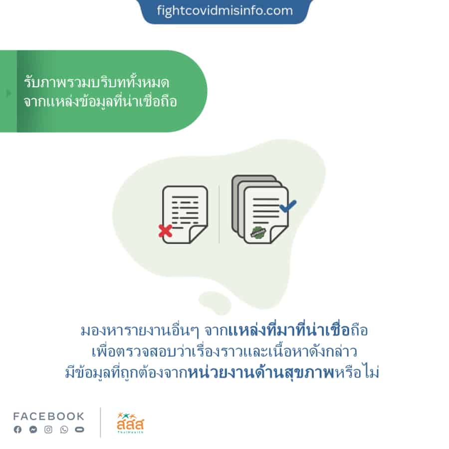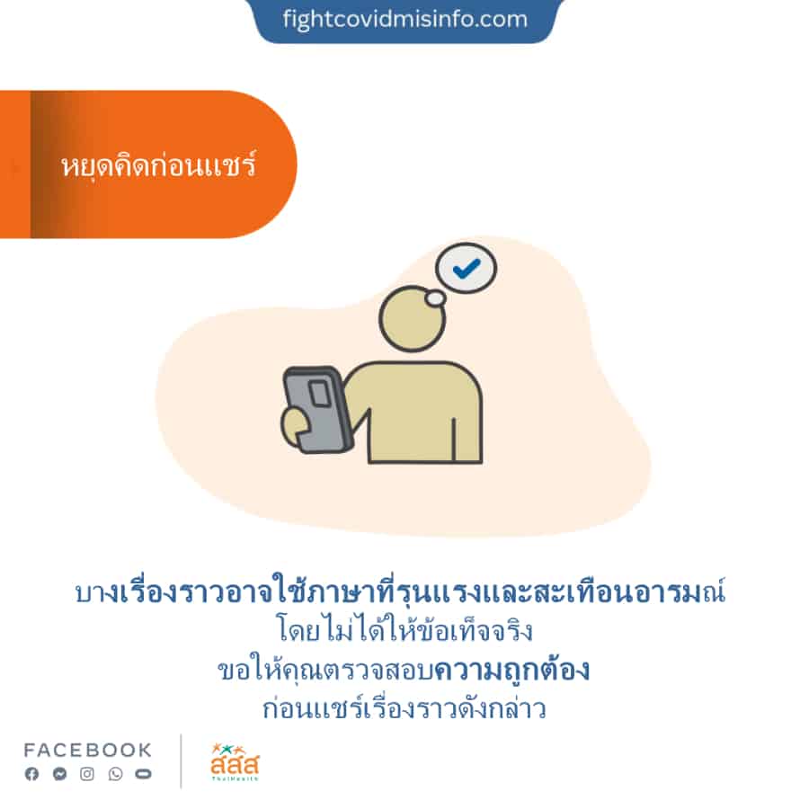 - หยุดคิดก่อนแชร์ บางเรื่องราวอาจใช้ภาษาที่รุนแรงและสะเทือนอารมณ์โดยไม่ได้ให้ข้อเท็จจริง ขอให้คุณตรวจสอบความถูกต้องก่อนแชร์เรื่องราวดังกล่าว หรืออ้างอิงจากแหล่งข้อมูลเกี่ยวกับสุขภาพที่เป็นทางการและน่าเชื่อถือ เช่น กระทรวงสาธารณสุข สำนักงานกองทุนสนับสนุนการสร้างเสริมสุขภาพ (สสส.) ผ่านศูนย์ข้อมูลโควิด-19 บน Facebook