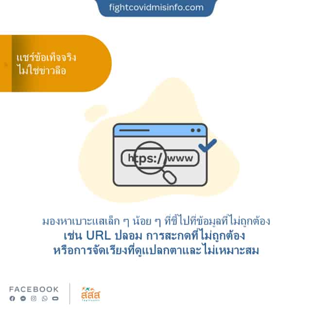 - แชร์ข้อเท็จจริง ไม่ใช่ข่าวลือ ข้อมูลที่ไม่ถูกต้องเกี่ยวกับโควิด-19 มักแพร่กระจายบนเว็บไซต์ที่สร้างให้ดูเหมือนของจริง ขอให้คุณมองหาเบาะแสเล็กๆ น้อยๆ ที่ชี้ไปยังข้อมูลที่ไม่ถูกต้อง เช่น URL ปลอม การสะกดที่ไม่ถูกต้อง หรือการจัดหน้าที่ดูแปลกตาและไม่เหมาะสม เป็นต้น