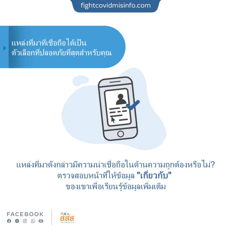 - แหล่งที่มาที่เชื่อถือได้ เป็นตัวเลือกที่ปลอดภัยที่สุดสำหรับคุณ ตรวจสอบหน้า “เกี่ยวกับ” หรือ About เพื่อหาข้อมูลเพิ่มเติมถึงความน่าเชื่อถือของแหล่งที่มานั้นๆ คุณยังสามารถตรวจสอบว่าหน่วยงานสาธารณสุขยืนยันหรือขัดแย้งกับข้อมูลดังกล่าวหรือไม่