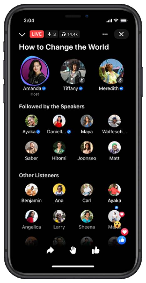 ไม่ใช่แค่ตัวฟีเจอร์ที่คล้ายกัน UI ห้องแชทของ Facebook เองก็คล้ายกับห้องแชทด้วยเสียงของ Clubhouse และ Spaces จาก Twitter มาก โดยจะมีรูปโปรไฟล์ของเจ้าของห้องอยู่ที่ด้านบน ตามด้วยรายชื่อและรูปโปรไฟล์ของผู้ฟังที่อยู่ด้านล่าง