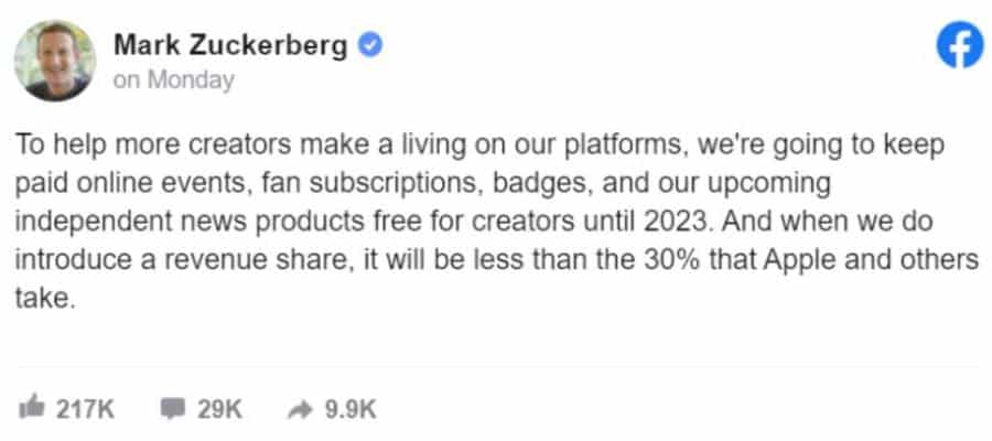 Mark Zuckerberg ซีอีโอของ Facebook กล่าวว่า บริษัทจะยังไม่หักเปอร์เซ็นต์ของรายได้สำหรับ Creators ต่อไปจนถึงปี 2023 ซึ่งนโยบายนี้ครอบคลุมไปถึงอีเว้นท์ออนไลน์แบบเสียเงินด้วย