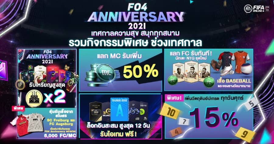 กิจกรรมครบรอบของ FIFA ONLINE 4 เทศกาลความสุข สนุกทุกสนาม กิจกรรมให้ร่วมสนุก และรับของรางวัลฟรีๆแล้ว เราก็ยังยกขบวนเหล่าซุปตาร์มากมาย