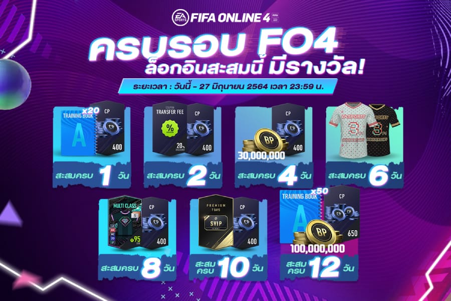 สายฟรีต้องเรียกว่าห้ามพลาด กับกิจกรรมล็อกอินสะสม รับคู่มือโค้ช และแต้ม CP ไว้อัปเกรดโค้ชเสริมความแกร่งให้นักเตะกันได้ และพิเศษยิ่งกว่า เมื่อล็อกอินสะสมครบ 6 วัน รับชุดแข่ง FO4 Anniversary KIT ไปเลยฟรีๆ ลิมิเต็ดแน่นอน โดยวิธีร่วมกิจกรรมก็ง่ายๆ เพียงแค่ล็อคอิน FIFA ONLINE 4 รายวัน (ไม่ว่าจะบนคอมฯหรือในมือถือ) ก็รับไอเทมไปเลย อะไรจะง่ายขนาดนี้! ยิ่งล็อคอินสะสม ของรางวัลยิ่งเจ๋ง!!