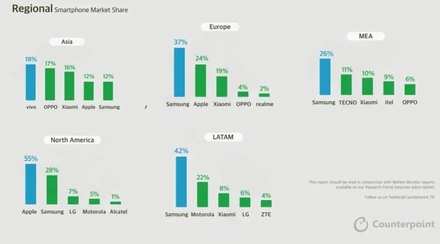 และถ้าแบ่งดูส่วนแบ่งตลาดสมาร์ทโฟนทั่วโลก แยกตามภูมิภาค เริ่มด้วยในโซนเอเซีย vivo ครองอันดับ 1 ตามมาด้วย OPPO และ Xiaomi ส่วน Apple อยู่ในอันดับที่ 4 และ Samsung อยู่อันดับที่ 5