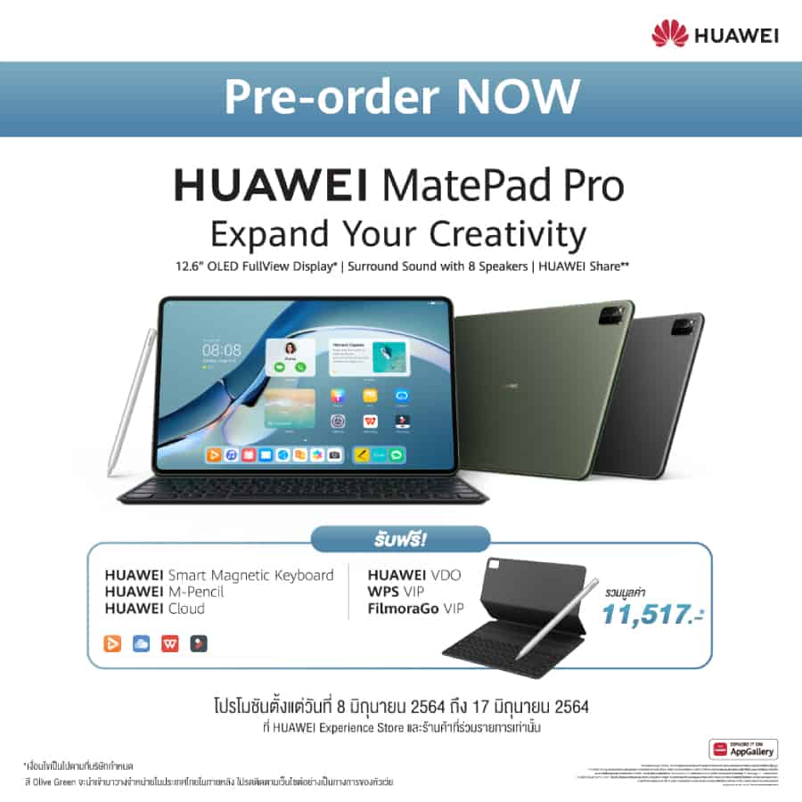 ย้ำอีกครั้งกับโปรโมชันสุดเอ็กซ์คลูซีฟก่อนใครในช่วงพรีออร์เดอร์ เมื่อซื้อ HUAWEI MatePad Pro 12.6-inch แท็บเล็ตพรีเมียม หน้าจอ OLED FullView Display ความละเอียด 2K แบตอึดพิเศษ ที่มาพร้อมฟีเจอร์อัปเกรดใหม่ และลูกเล่นระดับเทพอีกเพียบ ทั้งยังอัดแน่นด้วยแอปพลิเคชันเพื่อการใช้งานในทุกๆ ด้านอย่างมากมายเพียงแค่โหลดผ่าน HUAWEI AppGallery โดยแท็บเล็ตพรีเมียมน้องใหม่ HUAWEI MatePad Pro 12.6-inch มาด้วยสี Matte Grey สุดคลาสสิก ในราคา 28,990 บาท พรีออเดอร์ตั้งแต่วันที่ 8 มิถุนายน 2564 ถึง 17 มิถุนายน 2564 รับทันทีของสมนาคุณแบบเน้นๆ มูลค่ารวม 11,517 บาท ประกอบไปด้วย HUAWEI Smart Magnetic Keyboard, HUAWEI M-Pencil, HUAWEI Cloud, HUAWEI VDO, WPS VIP และ FilmoraGo VIP เมื่อซื้อผ่าน HUAWEI Experience Store และร้านค้าที่ร่วมรายการเท่านั้น