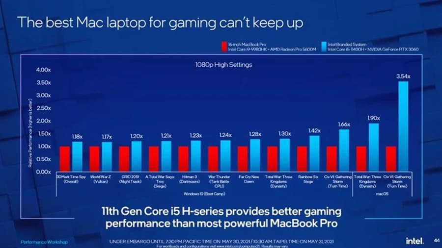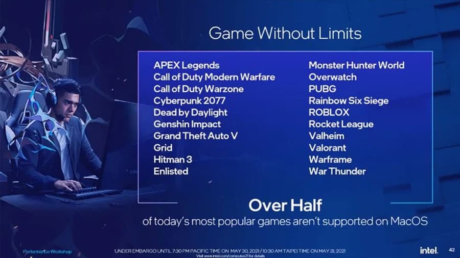 ทาง Intel ได้สรุปข้อโต้แย้งที่อ้างว่า ด้วยประสบการณ์ด้าน เล่นเกม ที่ไม่ดีเอาซะเลยบนอุปกรณ์ Mac ทำให้อุปกรณ์ Windows ที่ใช้ชิป Intel นั้นเหนือกว่า พร้อมเยาะเย้ยชิป M1 ของ Apple พร้อมคุยทับอีกว่า เกมยอดนิยมส่วนใหญ่นั้น ไม่ทำงานบน macOS