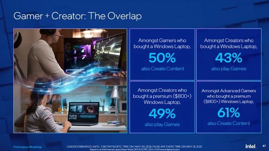 Intel ยังชูข้อมูลความเหมือนกันระหว่างครีเอเตอร์และเกมเมอร์ พร้อมแนะว่าผู้ใช้งาน Mac ส่วนใหญ่นั้นได้รับประสิทธิภาพและความเพลิดเพลินที่ไม่เพียงพอเนื่องจากตัวระบบมี “ตัวเลือกการเล่นเกมที่จำกัด“
