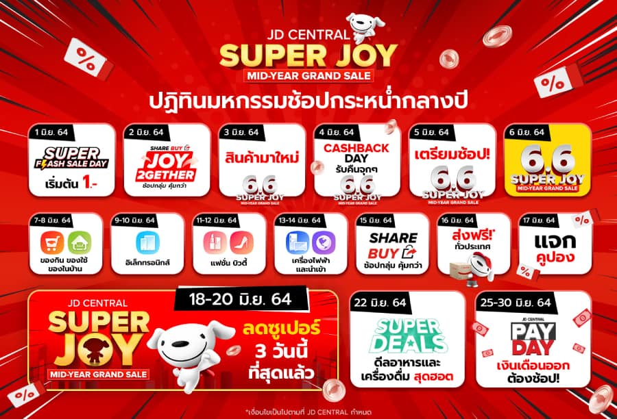- วันที่ 18 มิ.ย. – 20 มิ.ย. 64 ลดหนักจัดให้กับ SUPER JOY MID-YEAR GRAND SALE ช้อปให้สุด ปล่อยทุกดีลและพลังการช้อปในตัวคุณ!