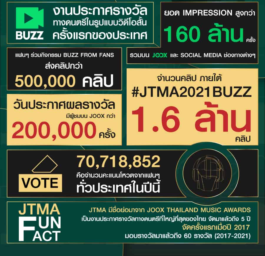 โดยตั้งแต่มีการประกาศรายชื่อผู้เข้าชิงทั้ง 5 สาขารางวัล ของ JTMA 2021 BUZZ และเปิดให้แฟนเพลงทั่วประเทศได้ร่วมโหวตเป็นระยะเวลา 2 สัปดาห์ก่อนการประกาศผล ปรากฏว่าได้รับการตอบรับจากแฟนๆ ทั่วประเทศอย่างถล่มทลาย ด้วยจำนวนโหวตรวมทุกรางวัลสูงถึงกว่า 70,718,852 โหวต และมีจำนวนคลิปทั้งหมดภายใต้ #JTMA2021BUZZ สูงถึงกว่า 1.6 ล้านคลิป นอกจากนี้ ก่อนวันประกาศผลรางวัล JOOX ยังได้มีการจัดกิจกรรมพิเศษด้วยการชวนแฟนๆ มาร่วมเชียร์ และส่งแรงให้ใจศิลปินผ่านการทำคลิปสั้น และอัปโหลดขึ้น JOOX BUZZ ซึ่งมีผู้เข้าร่วมกิจกรรม BUZZ from Fans ในการส่งคลิปมากถึงกว่า 500,000 คลิป ในส่วนของวันประกาศผลรางวัลช่วงไลฟ์สดเมื่อวันที่ 28 พฤษภาคมที่ผ่านมา มีผู้เข้ามาชมบรรยากาศบน JOOX รวมสูงถึงกว่า 200,000 ครั้ง