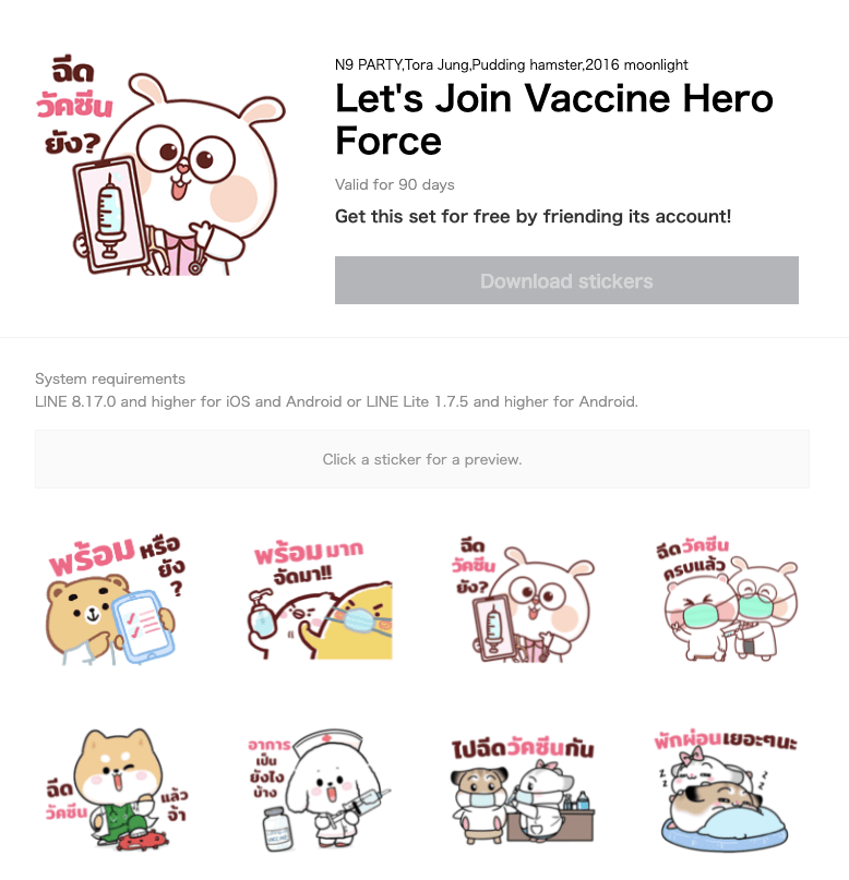 LINE ร่วมกับท็อปครีเอเตอร์ และ หมอพร้อม Official Account เปิดตัวสติกเกอร์ “มาร่วมเป็น วัคซีนฮีโร่ กันเถอะ” ดาวน์โหลดฟรี ใช้งานได้ฟรี 90 วัน เพื่อรณรงค์ชวนคนไทยฉีดวัคซีนต้านโควิด 19