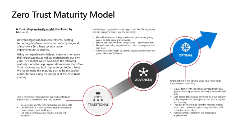 ก่อนจะเริ่มดำเนินการระบบรักษาความมั่นคงปลอดภัยแบบ Zero Trust สิ่งสำคัญลำดับแรกคือต้องประเมินมาตรฐานระบบความปลอดภัยขององค์กรในขณะนั้นเสียก่อนว่าอยู่ในจุดไหน และยังต้องยกระดับระบบความปลอดภัยในส่วนไหนบ้าง ดังนั้น ไมโครซอฟท์จึงได้พัฒนา Zero Trust Maturity Model ขึ้น เพื่อใช้ประเมินความสามารถขององค์กรในการปกป้องระบบ ข้อมูล และผู้ใช้ ภายใต้หลักการของ Zero Trust