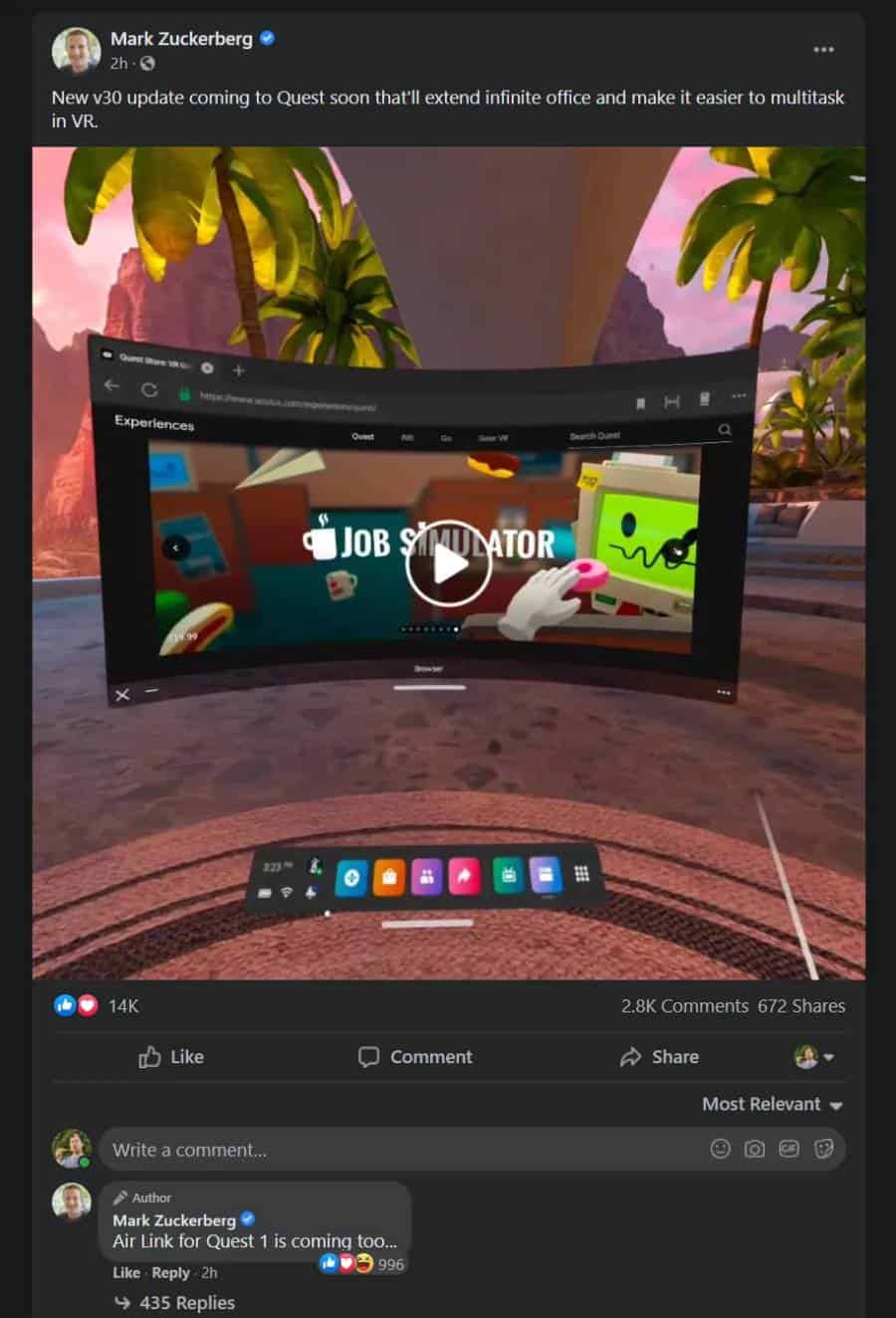 มาร์คได้คอมเม้นท์ใต้โพสต์ที่เขาอัปเดตเกี่ยวกับเวอร์ชั่น 30 สำหรับ Quest ว่าระบบ Air Link ก็กำลังจะมาถึงเร็ว ๆ นี้ด้วย นอกจากนี้เขายังแชร์คลิปที่มีการเปิดใช้งานหลายหน้าต่างพร้อมกันบน Oculus Home ท่ามกลางสภาพแวดล้อมเสมือนจริง ที่ให้ความรู้สึกเหมือนเรากำลังมองผ่านหน้าจอแบบโค้ง