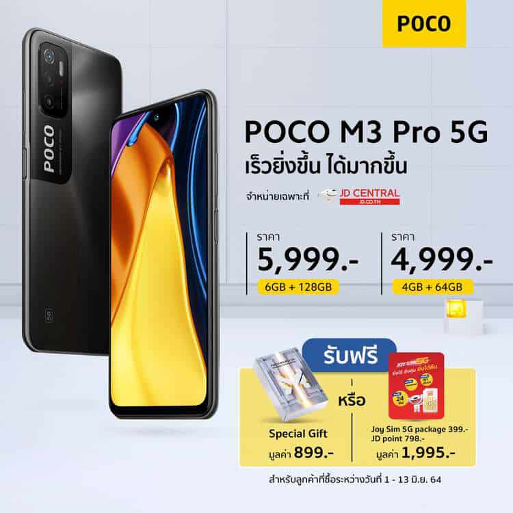 POCO M3 Pro 5G พร้อมมอบประสิทธิภาพและประสบการณ์ความบันเทิงที่ดีที่สุดในระดับราคาที่ทุกคนเป็นเจ้าของได้ ราคา เริ่มต้นเพียง 4,999 บาท วางจำหน่ายแบบเอ็กคลูซีฟ เฉพาะที่ JD Central ตั้งแต่วันที่ 1 มิถุนายนนี้เป็นต้นไป พิเศษ! สำหรับลูกค้าที่ซื้อในระหว่างวันที่ 1-13 มิถุนายน 2564 เลือกรับของสมนาคุณพิเศษ ฟรี!