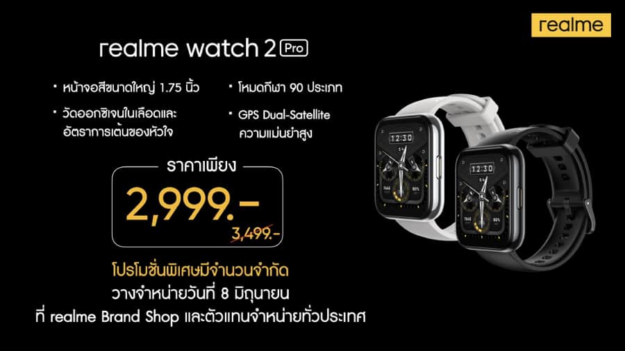 realme Watch 2 Pro ‘Style Meets Sports’ สมาร์ทวอทช์อัจฉริยะ ที่มาพร้อมหน้าจอสีขนาดใหญ่ 1.75 นิ้ว รองรับโหมดกีฬา 90 ประเภท ฟีเจอร์วัดออกซิเจนในเลือดและอัตราการเต้นของหัวใจ และ GPS Dual-Satellite ความแม่นยำสูง ในราคาพิเศษจำนวนจำกัด! เพียง 2,999 บาท จากปกติ 3,499 บาท โดยวางจำหน่ายพร้อมกันทั่วประเทศ วันที่ 8 มิถุนายนนี้ ที่ realme Brand Shop และตัวแทนจำหน่ายทั่วประเทศ