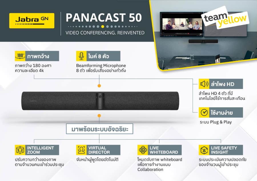 Jabra Panacast 50 เป็นสุดยอดวีดีโอคอนเฟอร์เรนซ์บาร์รูปแบบใหม่ของตระกูล Panacast ที่ออกแบบมาเพื่อการประชุมในห้องขนาดเล็กถึงขนาดกลาง โดยนอกจากการดีไซน์ที่โดดเด่นในรูปทรงแบบ Video Sound Bar ที่รวมสุดยอดเทคโนโลยีภาพและเสียงเพื่อการประชุมเข้าด้วยกัน การจับภาพความละเอียดระดับ 4k โดยจะใช้กล้องความละเอียด 13 เมกกะพิกเซล 3 ตัว ที่ยังคงรับภาพได้ถึง 180 องศา ทำให้ผู้เข้าร่วมประชุมสามารถนั่งเว้นระยะห่างในห้องประชุมได้อย่างไม่มีข้อจำกัด ระบบ ซูมอัจฉริยะ (Virtual Director)