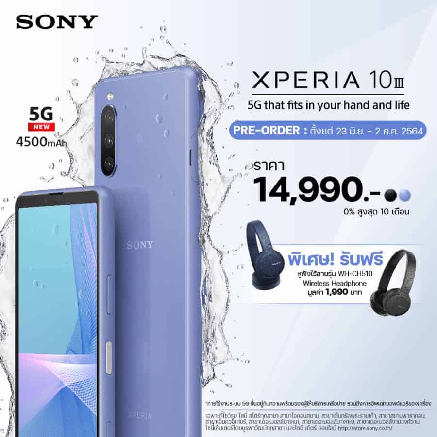 สำหรับ “Xperia 10 III” พร้อมวางจำหน่ายในตลาดเมืองไทย กรกฎาคม ศกนี้ ในราคา 14,990 บาท โดยตัวเครื่องมีสีให้เลือก 2 สีด้วยกัน คือสีดำ และสีน้ำเงิน มาพร้อมโปรโมชั่นสุดพิเศษสำหรับลูกค้าที่จองซื้อเครื่อง ตั้งแต่วันที่ 23 มิถุนายน – 2 กรกฎาคม ศกนี้ จะได้รับหูฟังไร้สาย Wireless Headphone Bluetooth รุ่น WH-CH510 สีดำ หรือน้ำเงิน มูลค่า 1,990 บาท เพื่อสร้างประสบการณ์บันเทิงได้เต็มอิ่มยิ่งขึ้น