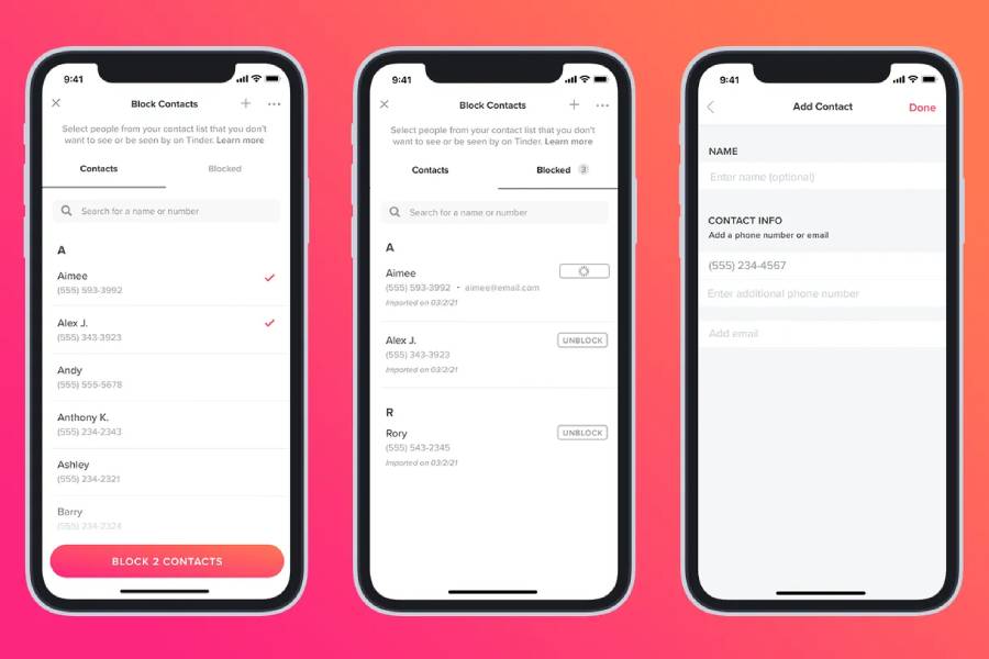 ในที่สุด Tinder ก็จะช่วยให้คุณสามารถหลีกเลี่ยงแฟนเก่า เพื่อนสนิท เพื่อนร่วมงาน ญาติ และใครก็ตามที่คุณไม่อยากเจอในแอป โดยจะเริ่มอนุญาตให้บล็อกผู้ใช้ได้ ด้วยหมายเลขโทรศัพท์ได้