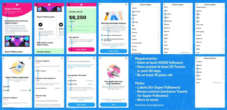 มีข่าวลือออกมาว่า Twitter กำลังพัฒนาฟีเจอร์ที่ชื่อ Super Follows ที่เป็นหนึ่งในฟีเจอร์แบบเสียเงิน แต่ก็สามารถสร้างรายได้ให้กับผู้ใช้ได้เช่นกัน โดยผู้ใช้จะสามารถสมัครใช้บริการ Super Follows เพื่อแชร์ทวีตและเนื้อหาออกเป็นหมวดหมู่ได้