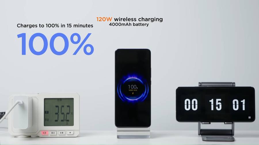 ส่วนการชาร์จแบบไร้สาย 120W สามารถชาร์จให้ขึ้นมา 10% ได้ในเวลาเพียง 1 นาทีเท่านั้น และได้ 50% ภายใน 7 นาที และสุดท้ายก็คือ 100% ในเวลาเพียง 15 นาทีเท่านั้น