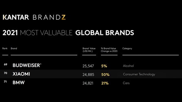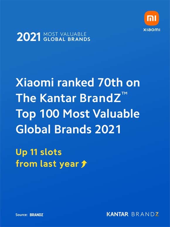 Xiaomi ขึ้นสู่อันดับ 70 ของแบรนด์ที่มีมูลค่าสูงที่สุดในโลกในปี 2021 สามปีซ้อนที่เสียวหมี่ได้รับการจัดอันดับด้วยมูลค่าแบรนด์ที่เพิ่มขึ้น 50% เมื่อเทียบกับปีที่แล้วตามรายงานของ Kantar