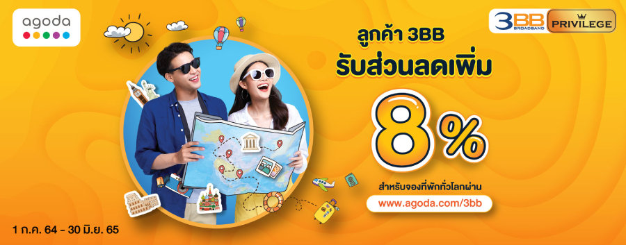 ที่ Agoda มีโรงแรม รีสอร์ทและโฮสเทลให้เลือกพักมากมายกว่า 2 ล้านแห่งทั่วโลก สำรองห้องพักทางออนไลน์ ได้ง่ายๆไม่ยุ่งยาก ลูกค้า 3BB รับส่วนลดเพิ่ม 8% สำหรับจองที่พักทั่วโลก, ส่วนลด 1.5% สำหรับการจองเที่ยวบิน และส่วนลด 3% สำหรับบริการ Packages จองเที่ยวบินพร้อมที่พัก ผ่าน Agoda
