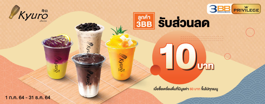 เลือกสั่งเครื่องดื่มประเภทชานมไข่มุก มัทฉะ โฮจิฉะ ชาเขียวมะลิ ชาอู่หลง ฯลฯ ที่ผ่านการคัดสรรชาคุณภาพเยี่ยมจากไต้หวันและญี่ปุ่นด้วยกระบวนการชงที่พิถีพิถัน ลูกค้า 3BB รับส่วนลด 10 บาท เมื่อซื้อเครื่องดื่มมูลค่า 60 บาท ขึ้นไปทุกเมนู เพียงแสดงรหัสเพื่อรับสิทธิ์ได้ที่ Kyuro Tea สาขาสาทรซิตี้ทาว์เวอร์ ชั้นใต้ดิน ระยะเวลาโปรโมชั่นถึง 31 ธันวาคม 2564